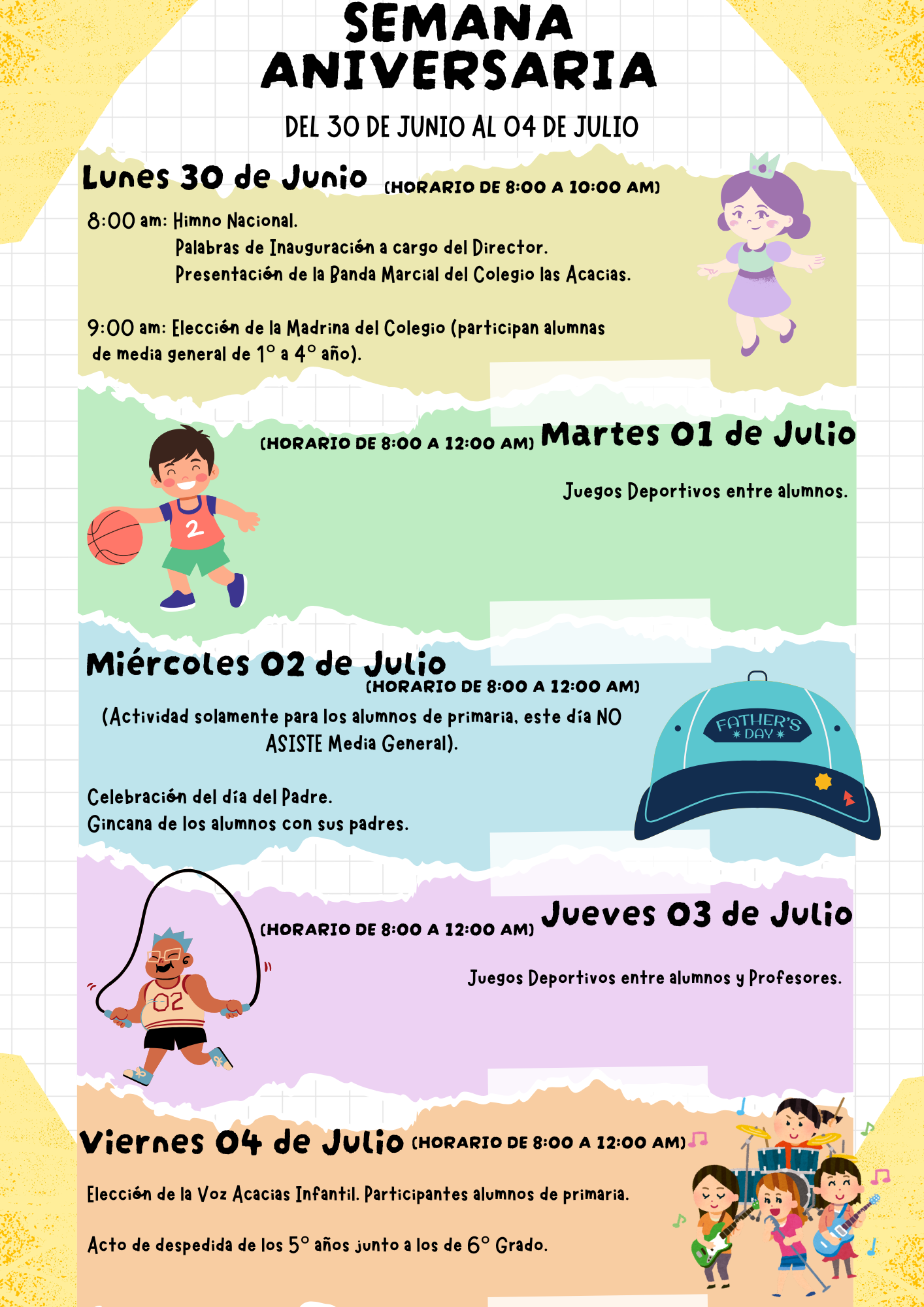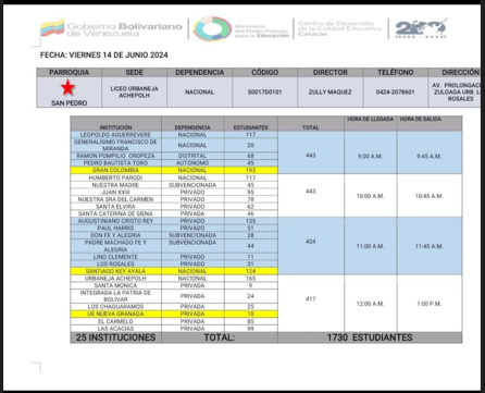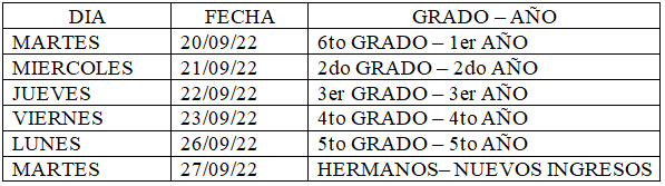 Martes 30-09-25: Todos los grados de Primaria (6.50am) y todos los cursos de Media General según el horario de clase .